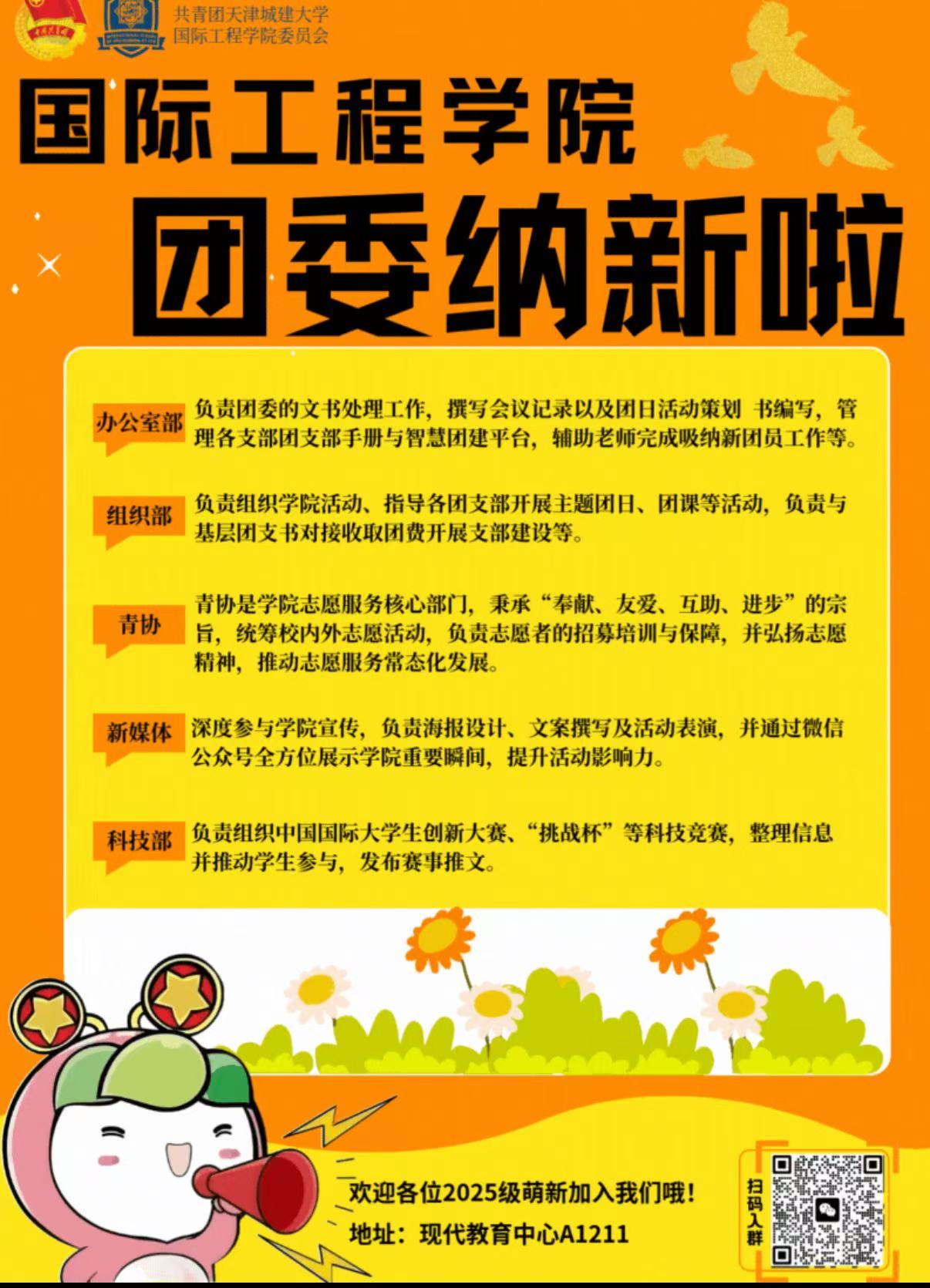 团委办公室的工作需要“严谨”与“活力”并存。以“主人翁”心态主动成长。愿作青春齿轮,精密咬合每份热忱,在服务的脉络里传递团委的温度与光芒。